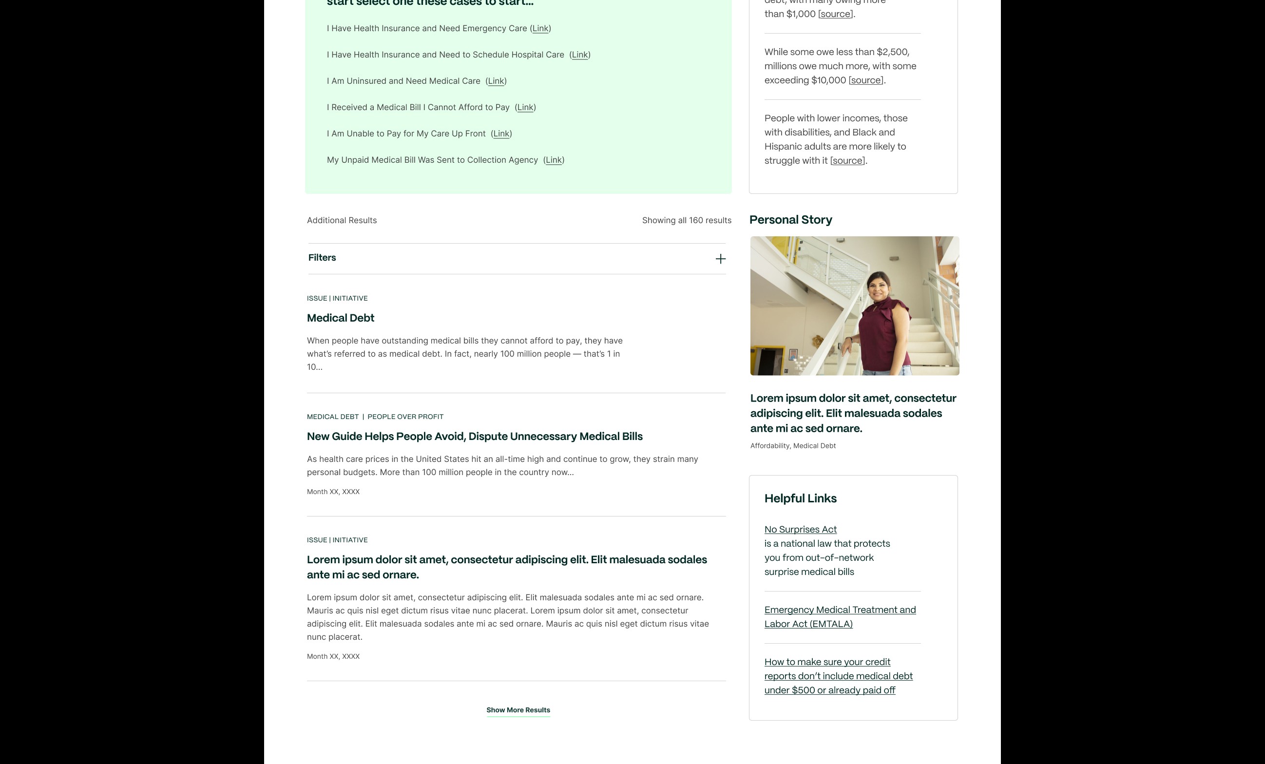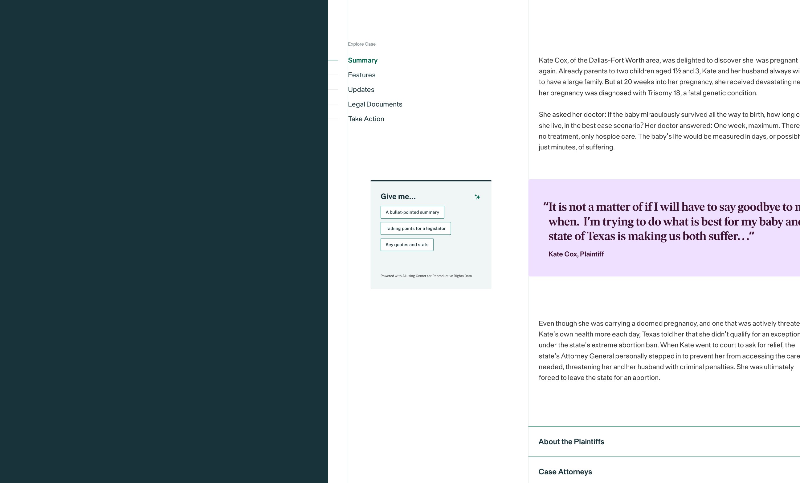 While working with a legal advocacy org, we found that even experts and advocates are often overwhelmed by vast amounts of information. Providing a summaries feature quickly distills complex documents, saving valuable time and allowing users to grasp key insights efficiently. To ensure the summaries were accurate, we allowed site editors to review and approve a series of AI-generated answers. The pre-populated prompts were tested and ranked by users before launch.