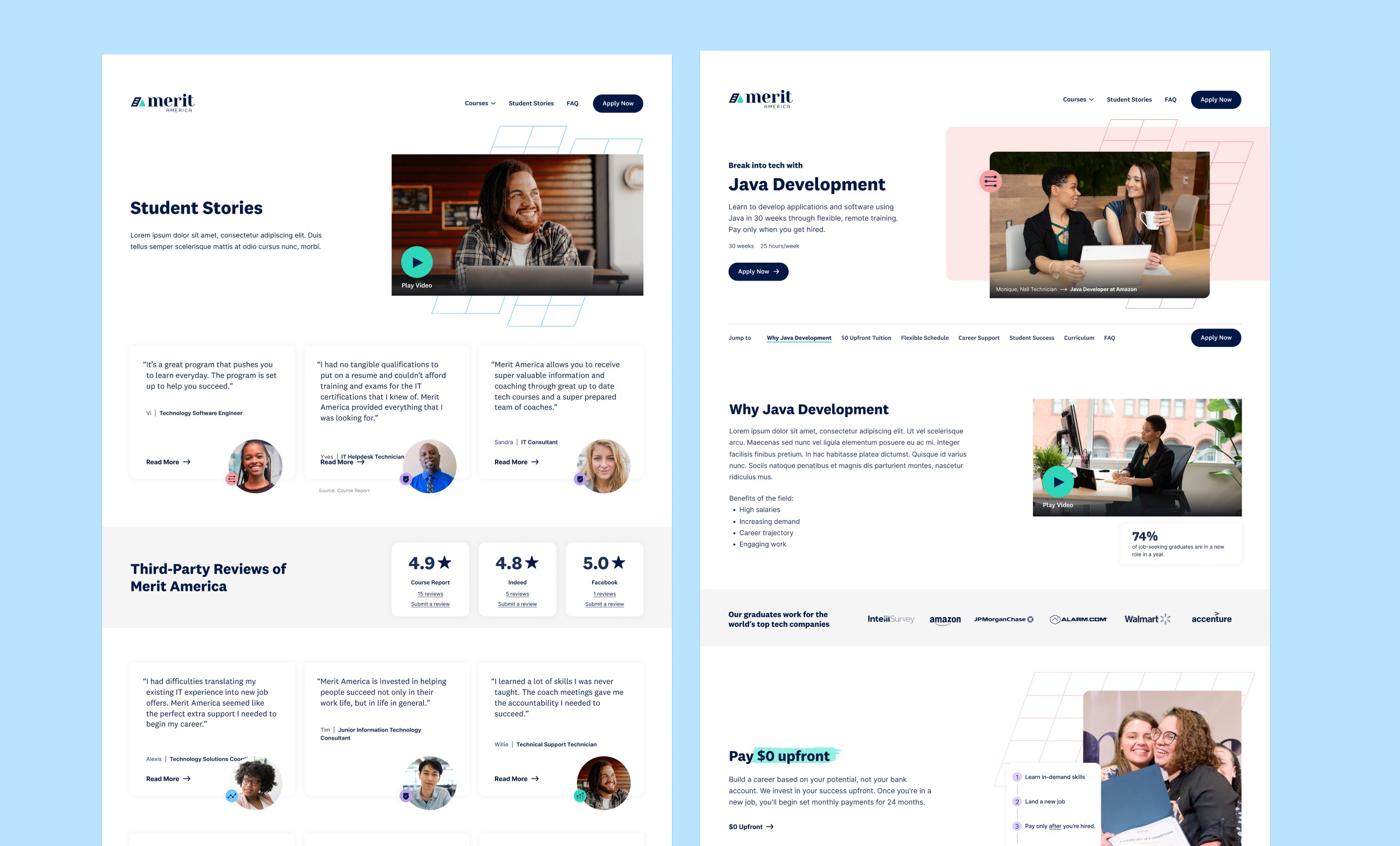 Merit America creates pathways to family-sustaining tech careers for people without college degrees. Graduates land real jobs with real companies. But their site was focused on describing their program rather than funneling potential learners into expressing interest. Many potential learners doubted whether someone "like them" could actually break into the tech industry. Merit America needed to prove their graduates' success while building confidence in hesitant applicants.